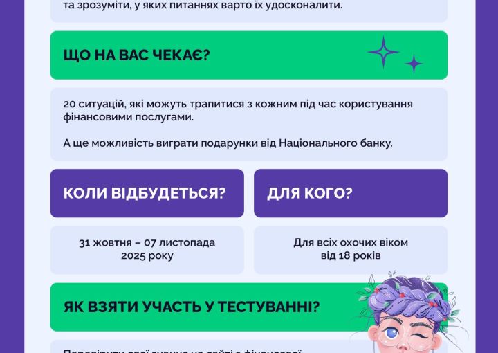 Перевіряйте свою фінансову грамотність і отримуйте подарунки від Національного банку України. Долучайтеся до Всеукраїнського тестування та діліться результатами з рідними, друзями і знайомими.