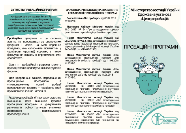 На сьогодні наказами Міністерства юстиції України затверджено п’ять видів пробаційних програм для повнолітніх та неповнолітніх суб’єктів пробації:
