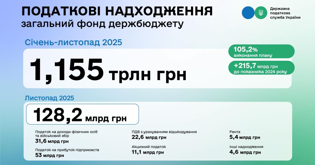 За підсумками листопада надходження платежів – 128,2 млрд гривень.