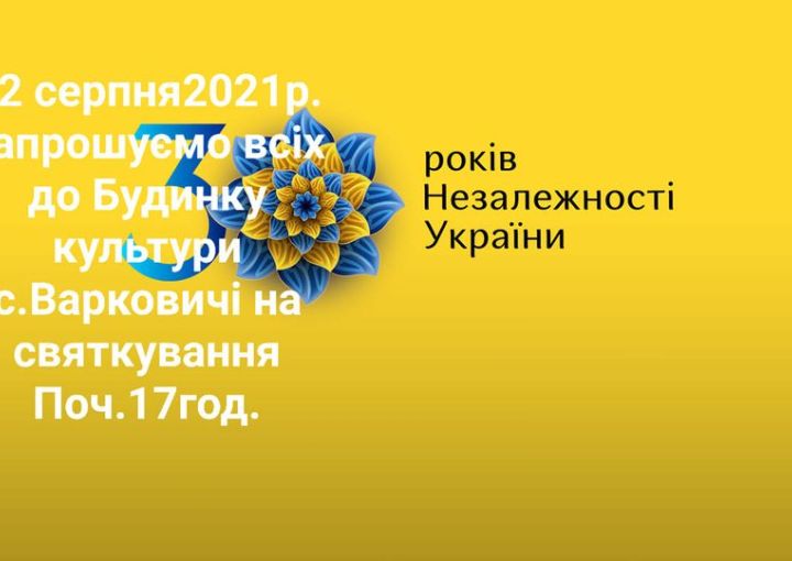 Запрошуємо всіх на святкування 30-річчя Незалежності України!!! 22 серпня 2021р. Будинок культури с.Варковичі урочистості з нагоди святкування 30-ої річниці Незалежності України В програмі свята : 16:00 - дитяча ігрова програма (батут , малюнок на асфальті ; 17:00 - урочистий концерт ; 21:00- святкова дискотека .