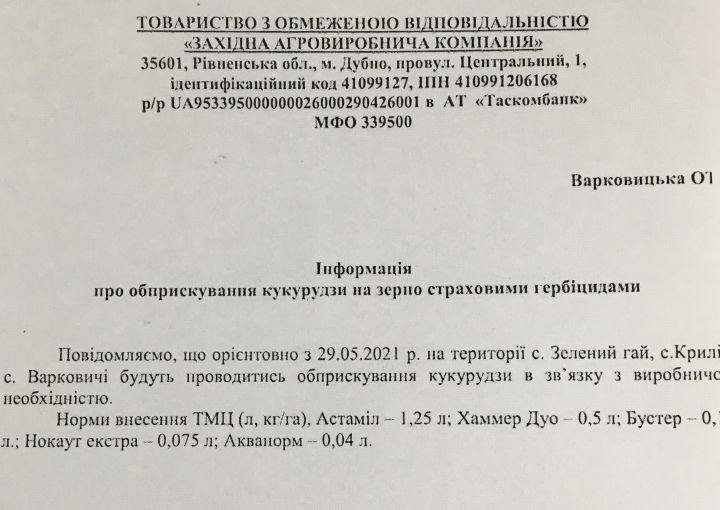 Інформація про обприскування кукурудзи на зерно страховими гербіцидами.Повідомляємо, що орієнтовно з 29.05.2021 р. на території с. Зелений Гай, с. Крилів, с. Варковичі будуть проводитись обприскування кукурудзи в зв"язку з виробничою необхідністю. Норми внесення ТМЦ (л,кг/га). Астаміл - 1.25 л; Хаммер Дуо - 0.5 л; Бустер - 0.1 л.; Нокаут екстра - 0.075 л.; Акванорм - 0.04 л.