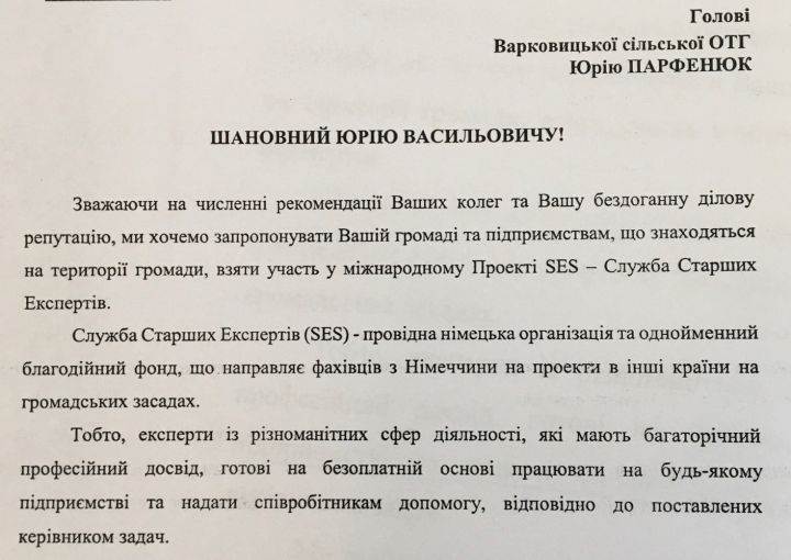 Провідна німецька організація та однойменний благодійний фонд SES (Служба Старших Експертів) пропонує підприємствам, що знаходяться на території громади, взяти участь у міжнародному Проекті, який передбачає залучення фахівців різноманітних сфер діяльності з Німеччини на громадських засадах. Проблеми , які вирішують експерти, полягають,в першу чергу, в підвищенні кваліфікації персоналу та наданні практичної допомоги при вирішенні задач технічного та організаційного характеру. Детальна інформація на сайті https://www.ses-bonn.de/ru/startseite Форма заявки (анкети) на залучення експертів…