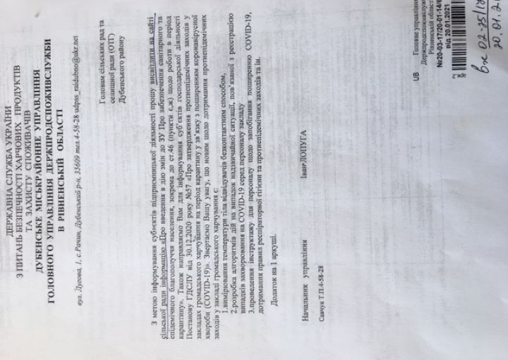 ДЕРЖАВНА СЛУЖБА УКРАЇНИ З ПИТАНЬ БЕЗПЕЧНОСТІ ХАРЧОВИХ ПРОДУКТІВ ТА ЗАХИСТУ СПОЖИВАЧІВДУБЕНСЬКЕ МІСЬКРАЙОННЕ УПРАВЛІННЯ ГОЛОВНОГО УПРАВЛІННЯ ДЕРЖПРОДСПОЖИВСЛУЖБИ В РІВНЕНСЬКІЙ ОБЛАСТІ Подала документи головам сільських рад та селищної громади (ОТГ) Дубенського району з метою інформування суб′єктів підприємницької діяльності.