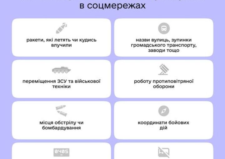 За які кадри в соцмережах вам загрожує КРИМІНАЛЬНА ВІДПОВІДАЛЬНІСТЬ?  Ракети, які летять або кудись потрапили, місця обстрілу або потрапляння снаряда, адреси чи координати боїв.  Назви вулиць, зупинки транспорту, магазини, заводи. Переміщення українських військових, військові об'єкти, номери автомобілів, бронетехніки.  Робота протиповітряної оборони.  Потерпілі чи загиблі (крім офіційних даних). За поширення даних про направлення або переміщення зброї та боєприпасів загрожує від 3 до 5 років позбавлення волі. Оприлюдните в соцмережах інформацію про переміщення, рух або розміщення ЗСУ —…