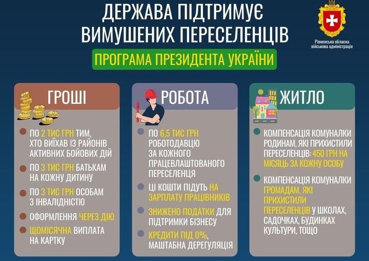 Уряд розпочинає масштабну програму Президента України з допомоги українцям, які вимушено покинули свої домівки через бойові дії. Держава виплатить кожному переселенцю в Україні мінімальну грошову щомісячну допомогу в сумі 2 тисячі гривень. Виплати здійснюватимуться через Дію, на картку в банку. Також 3 тисячі гривень родина отримуватиме на кожну дитину, яка через війну, через всі ці жахіття вимушено переїхала в більш безпечні регіони. Разом із тим, держава виплачуватиме роботодавцям, які беруть на роботу переселенців із постраждалих регіонів, по 6,5 тисячі грн за кожного…