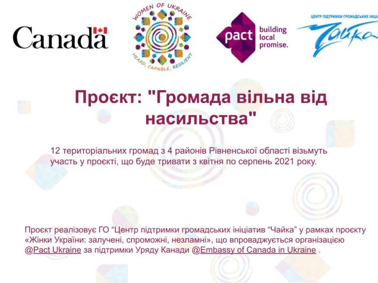 ГО «Центр підтримки громадських ініціатив «Чайка» з квітня по серпень 2021 року здійснює діяльність з метою вдосконалити практики реагування на випадки гендерно обумовленого насильства усіх суб’єктів взаємодії у 12 територіальних громадах Рівненської області