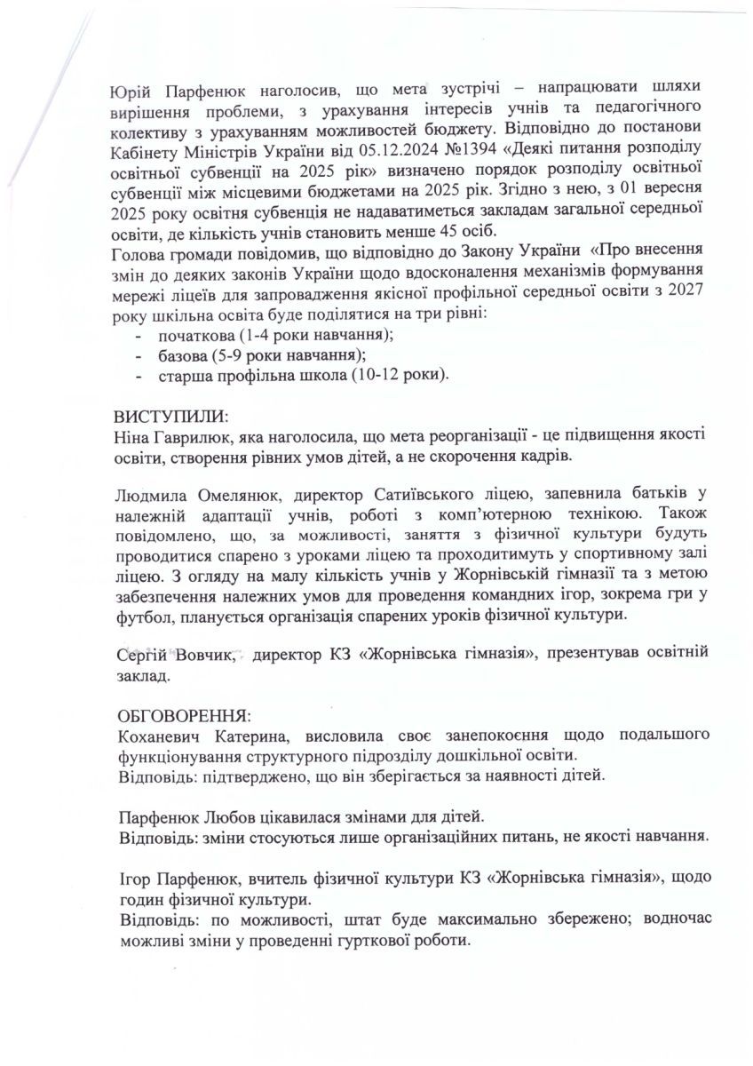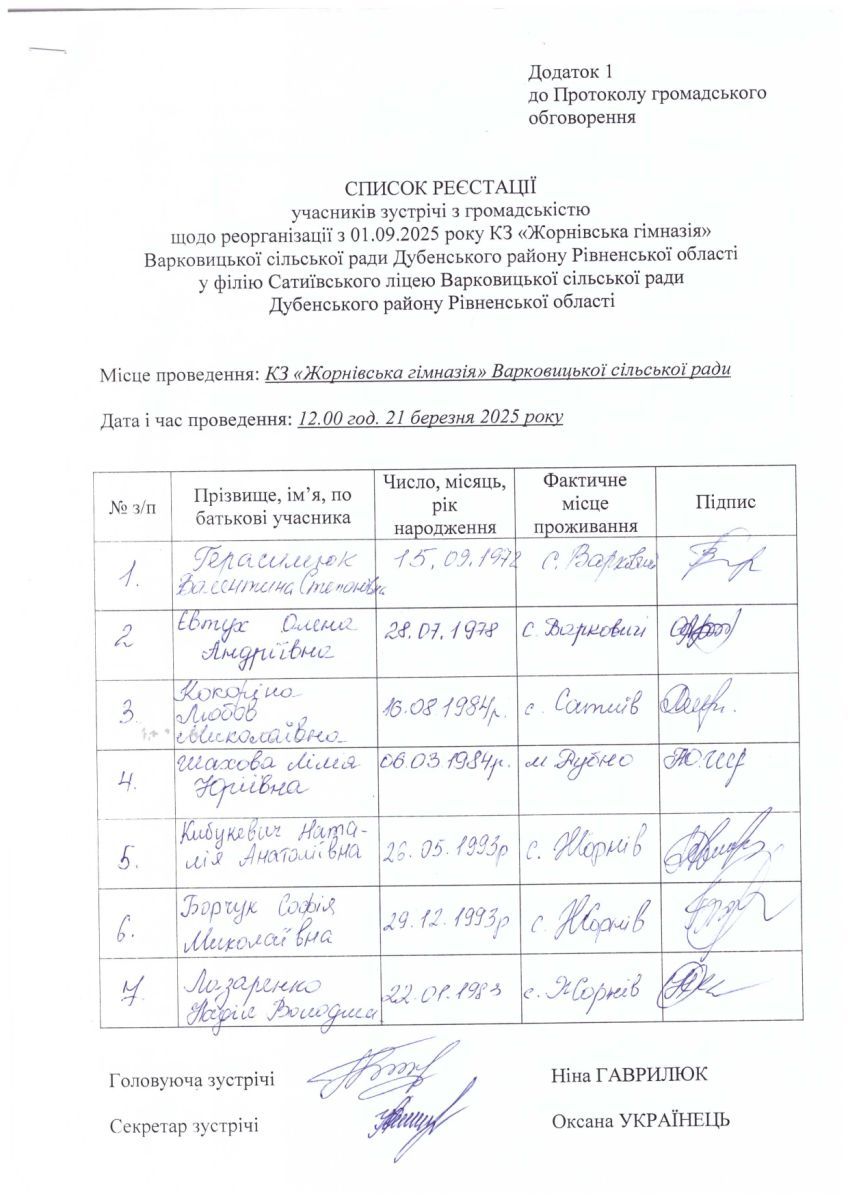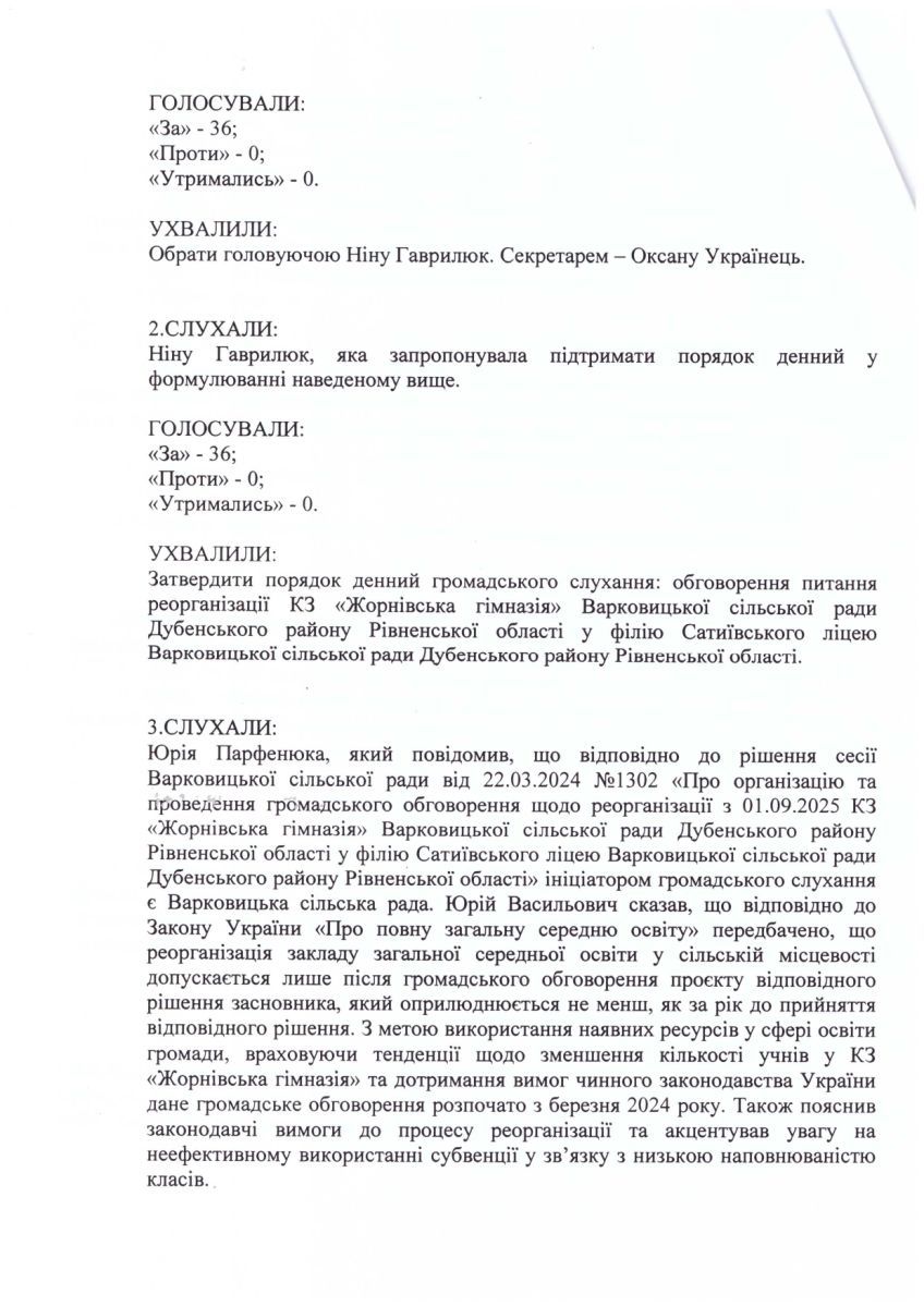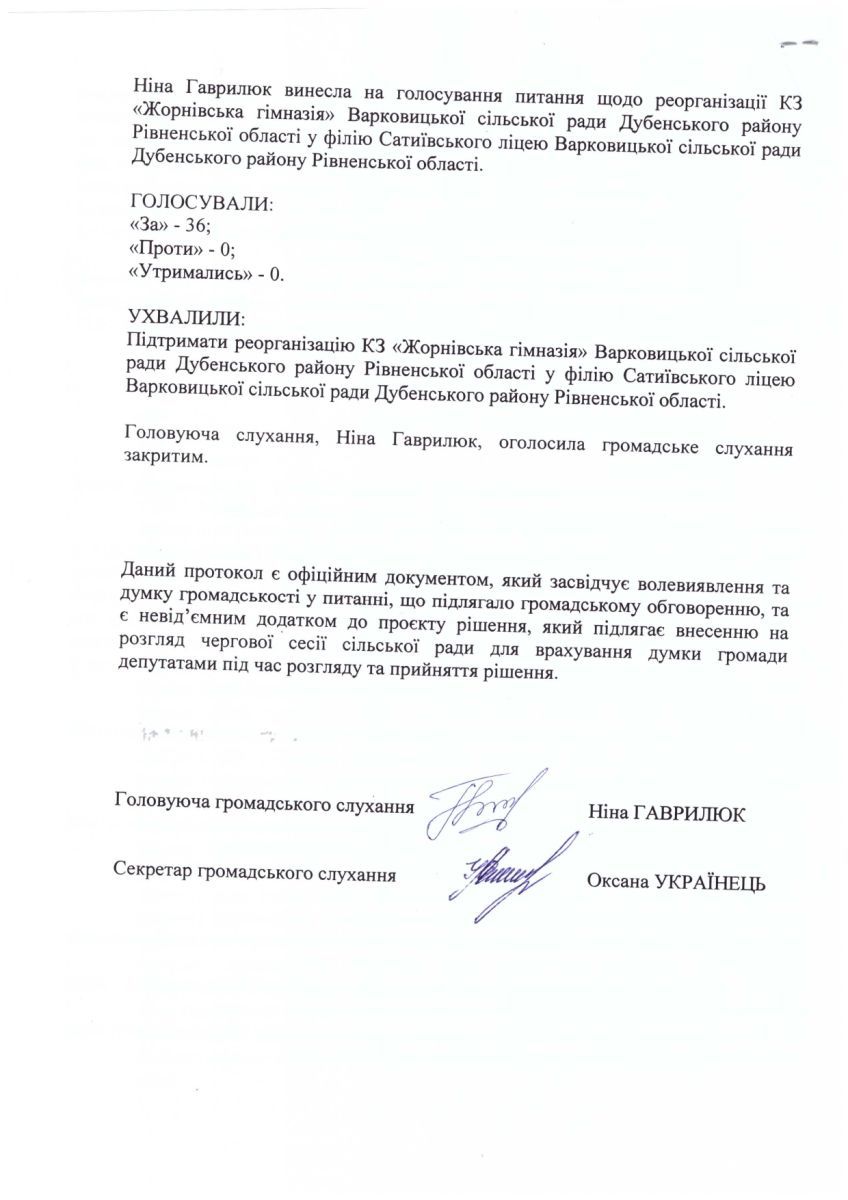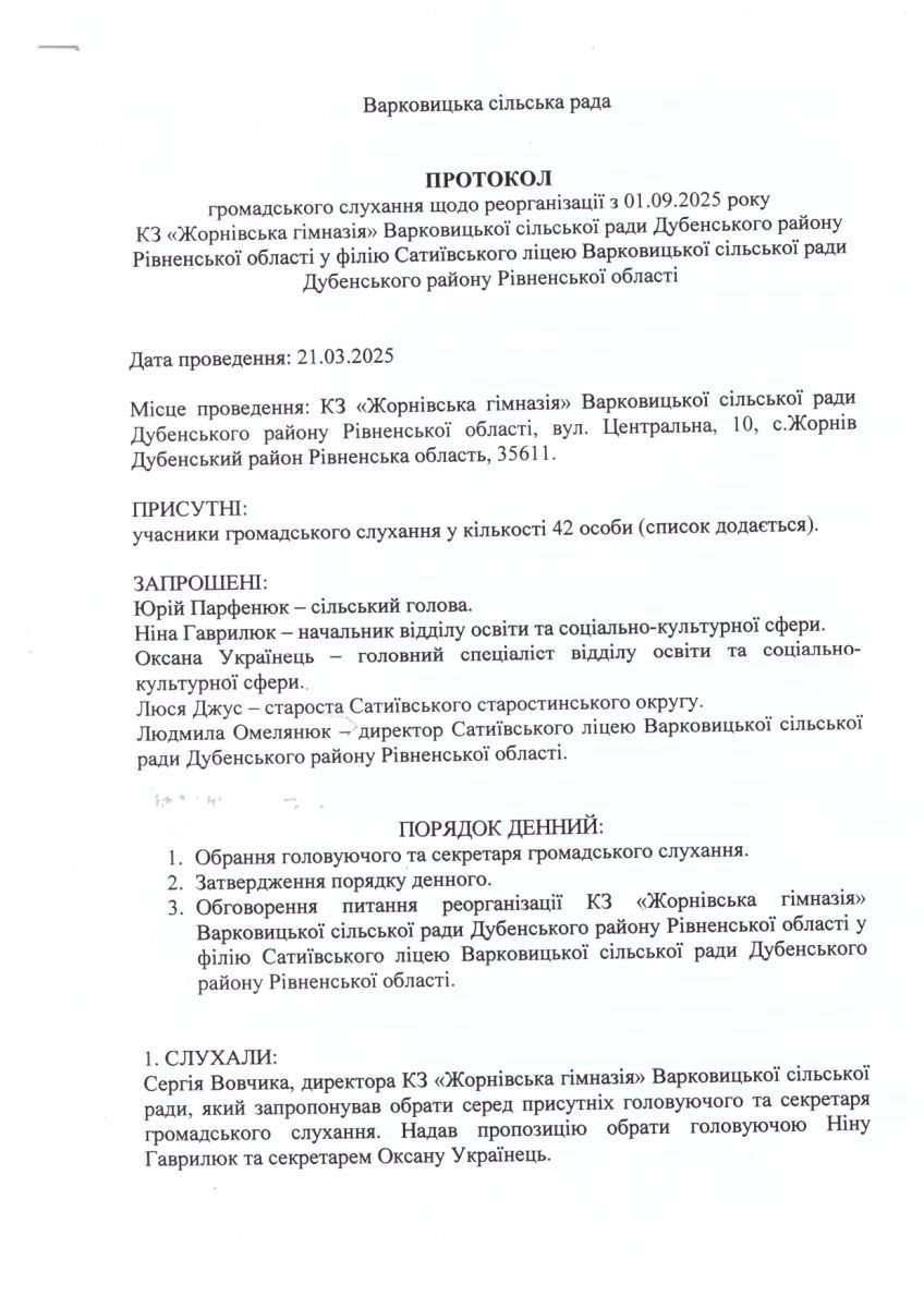Протокол громадського слухання щодо реорганізації з 01.09.2025 року КЗ «Жорнівська гімназія» Варковицької сільської ради Дубенського району Рівненської області у філію Сатіївського ліцею Варковицької сільської ради Дубенського району Рівненської області